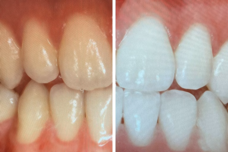 Schienen-Bleaching, sogenanntes Home-Bleaching. Hierbei wird ein weniger konzentriertes Bleichmittel in eine Schiene eingefüllt, die zuvor passgenau angefertigt wurde. Diese Schiene verbleibt über Nacht auf den aufzuhellenden Zähnen. Dieses Verfahren ist sehr schonend und vor allem bei empfindlichen Zähnen geeignet. Die Schienen werden an mehreren Tagen hintereinander getragen, bis das gewünschte Ergebnis erreicht ist. Auch hier findet eine Woche vor Beginn eine professionelle Zahnreinigung (PZR) statt.